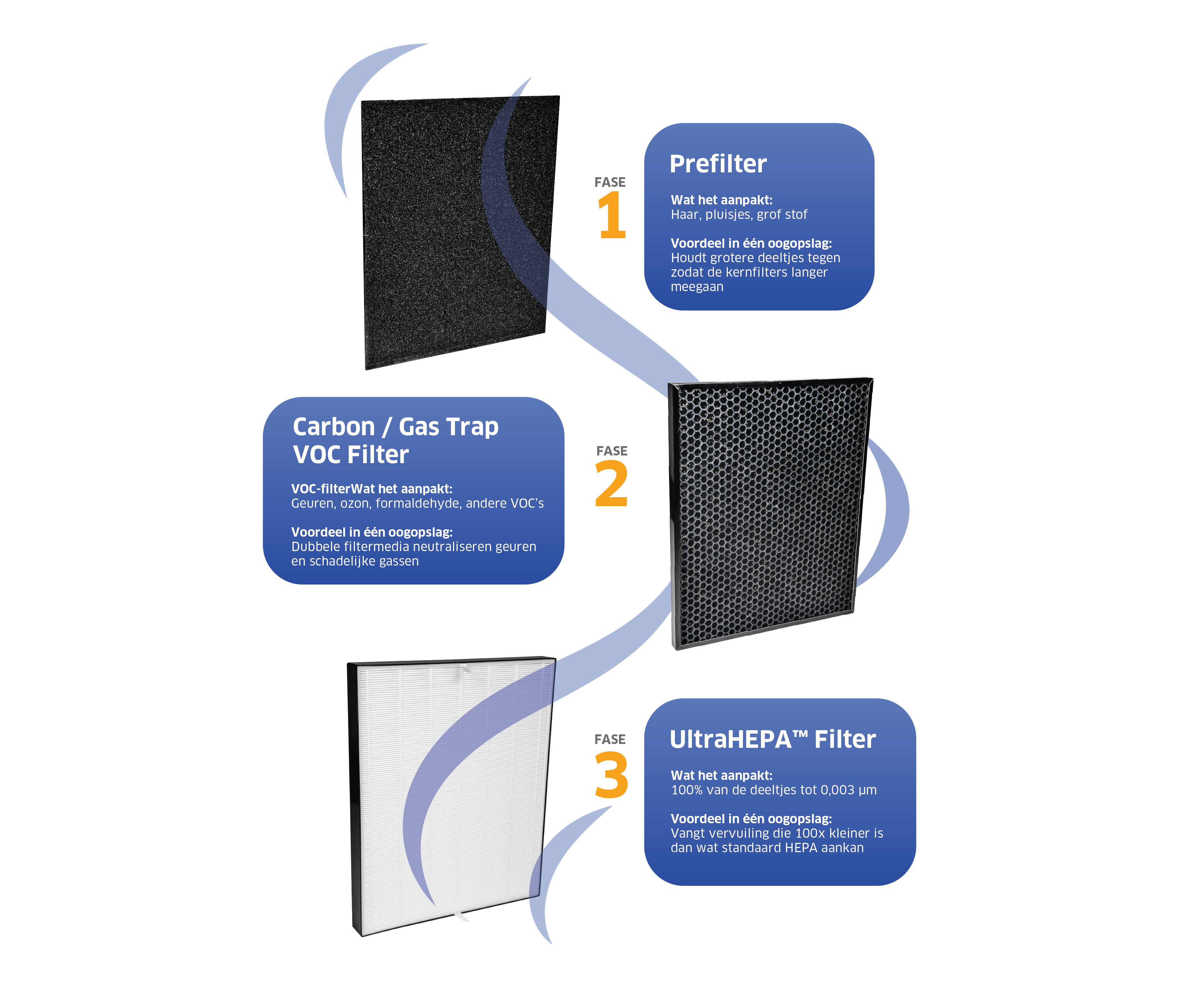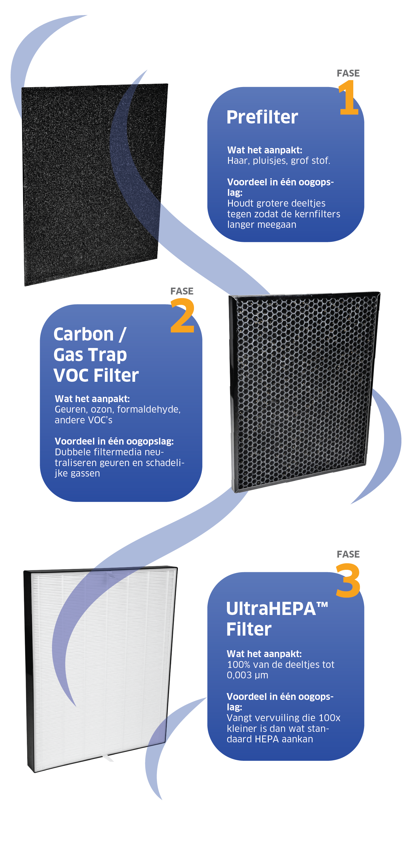 AmazingAir combineert een UltraHEPA™-filter met slimme luchtstroomtechnologie om zowel deeltjes als gassen snel en stil uit de lucht te verwijderen. Hieronder zie je hoe elke filterlaag werkt: